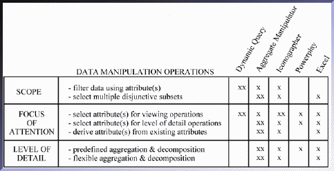 The exploration goals that a user will have are clearly task dependent. These goals are also dynamic, changing as the user views various data and displays. Data manipulation is one of the processes that users perform in data exploration. Springmeyer performed an extensive empirical analysis of the processes that scientists do in data analysis [8]. Her category "data culling" is most similar to that of data manipulation. We have analyzed the data manipulation process in detail for object-attribute data and have identified three types of exploration goals needed: controlling scope, selecting focus of attention, and choosing level of detail.