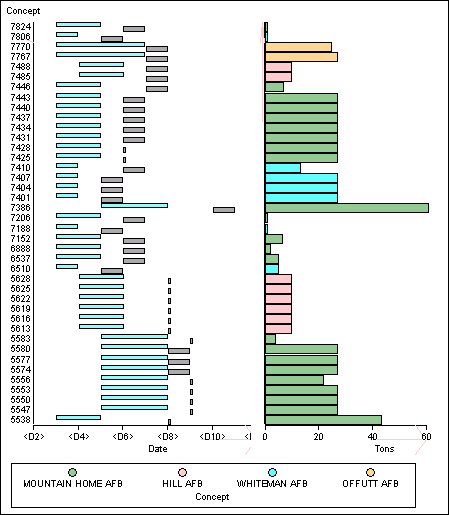 Figure 2, below, is a visualization designed with Sage to help the analyst explore problems in the schedule. Using such visualizations, the analysts diagnose the problems and make decisions about how to eliminate them. The bars of various colors in the righthand chart indicate the amount of cargo in tons coming from different ports. In the lefthand chart, the blue bars indicate the dates during which the corresponding cargo needs to be transported, while the gray bars indicate the dates when the cargo has been scheduled to be transported. Since all gray bars end after the corresponding blue bars, all of the cargo deliveries are late. |