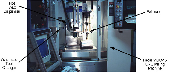 Commercialized SFF systems are customized machines, and high performance SFF apparatus can be relatively expensive. As an alternative to customization, or to robotic automation, we are exploring implementing SDM by simply adding deposition apparatus directly to existing CNC milling machines such as are typically found in machine shops throughout the world. In addition to shaping operations, the CNC milling machine provides the precision motion control required for deposition. When not being used for SDM, such an integrated CNC deposition and shaping machine can still be used as a conventional milling machine. For one example, the integrated CNC deposition/shaping machine shown above is being used to investigate the fabrication of 'green' ceramic structures using an extrusion deposition process. The machine is based upon a commercially available Fadal VMC-15 mill with an automatic tool changing carousel. An high pressure extruder is mounted on a pneumatically actuated slide that is attached to the Z-axis spindle housing of the NC machine. The slide is retracted when the extruder it is not in uses (e.g., during machining operations) and lowers the extruder into the workspace during deposition operations. The extruder is used to deposit both support and part materials; currently, we manually switch extrusion tubes/nozzles preloaded with the different materials.