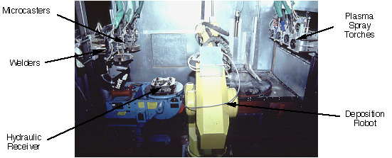 The deposition station consists of an acoustic chamber (for noise abatement and dust containment), an air handling system (for dust filtration and collection) and a robotic deposition system. The deposition robot, which is a 6-DOF GMF-S700 system, is equipped with a tool-changing wrist and is able to acquire one of several different deposition sources, which are mounted to a docking mechanism. To deposit each material, the robot picks up the appropriate deposition head and manipulates it over the growing shape. The feedstock mechanisms and power supplies for these sources are located upon a mezzanine above the acoustic chamber, and the pallet is moved into the chamber through a trap door. The current sources include arc and plasma sprayers, MIG welding, 'microcasting' and a hot wax gun. The wax is used as complementary support material for building polyurethane (PU) structures.