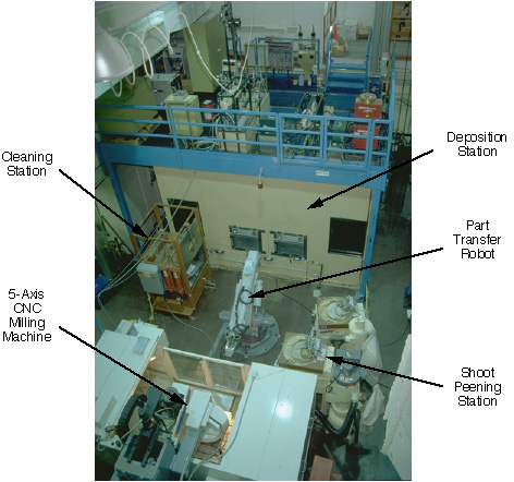 In order to be able to quickly explore alternative processes for SDM, we have implemented a robotic SDM system (see figure above). With this approach, parts are built-up on pallets, which are transferred from station-to station using a robotic palletizing system. Each station has a pallet receiver mechanism. The part transfer robot places the pallet on the receiver, which locates and clamps the pallet in place. The current SDM robotic facility consists of four processing stations; CNC milling, deposition, shot-peening and cleaning. The deposition station also uses robotics to integrate multiple deposition processes. Embedding operations are currently done manually. The entire SDM system is coordinated by a customized controller provided by Yokogawa Electric Corporation.In the testbed facility, the part transfer robot is a 6-DOF Motoman robot with a 120 kg payload capacity. The pallets have a 12" X 12" footprint. The shaping station is a 5-axis FADAL VMC-6030 CNC milling machine with a 21-head tool changer mechanism. The hydraulically-actuated receiver used in this station is able to repeatedly locate the pallet within approximately 0.0002 inches. When cutting fluids are used in milling operations, the pallet is then transferred to a cleaning station to remove residuals. A shot peening station, which uses a conventional pressurized media delivery system to blast small pellets of metal against layers, can be used to redistribute the stresses in a deposited layer.