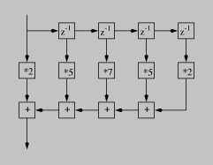 fun map: (samp -> samp) * signal -> signal fun map2: binop * signal * signal -> signal fun delay1: signal * samp -> signal fun scan: signal * samp * binop -> signal fun lut: address * signal -> signal fun sum_tile: samp * signal * int -> signal