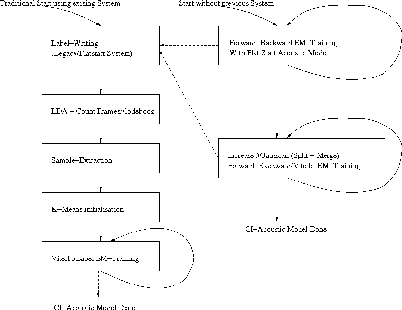 To train the context independent (CI) acoustic model (AM) used building a decision tree we will follow the right side of the training schemes. Starting from a initial flat-start AM. Improve the state assigments using Forward-Backward EM Training (Baum-Welch-Training) and then increase the number of parameters of the model, because during the next step we will need the mixture weights of the GMMs to compute a similarity of different contexts.