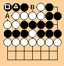 This situation arises in a variation of the Large Avalanche joseki, here reproduced in miniature.