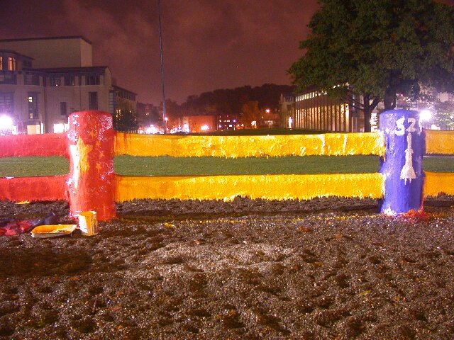 我自己是将近十二点到的CMU,也不知道鼎鼎大名的the fence在哪里,就在校园里溜达。因为从八点多就没有再上网了,也不知道最后到底有没有人去,有的话又有多少。 于是口袋里揣上一罐喷漆,心想如果找到the fence又不见人的话就涂个stupidmit到此一游好了。如果那时有人看见一个穿不合身旧军装的家伙在CMU里面四处东张西望,那多半就是我了。 好在CMU的校园不大,兜了个圈,隐约听到有人在说中文,走近一看,正是真英雄和小二。还有ee以及她昨天刚到米国的朋友,加上snowball。已经开始工作了。