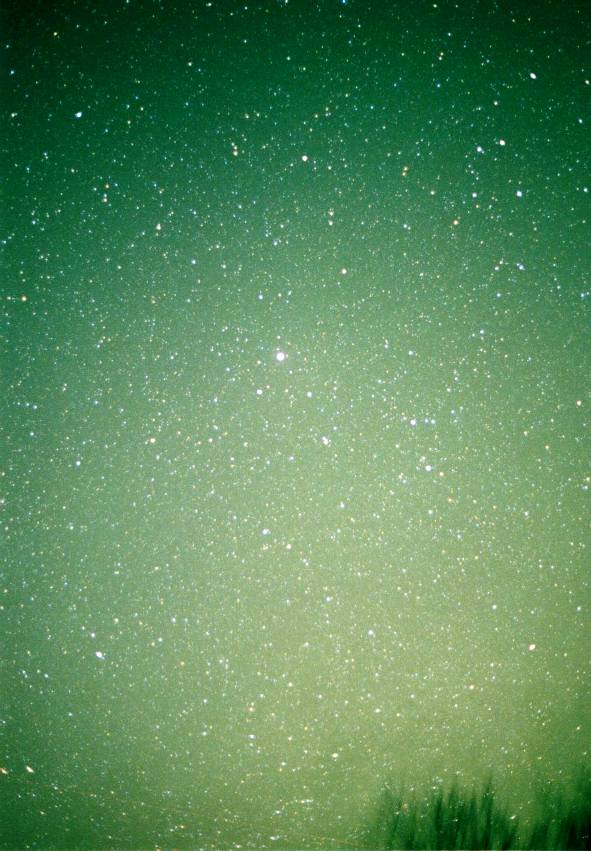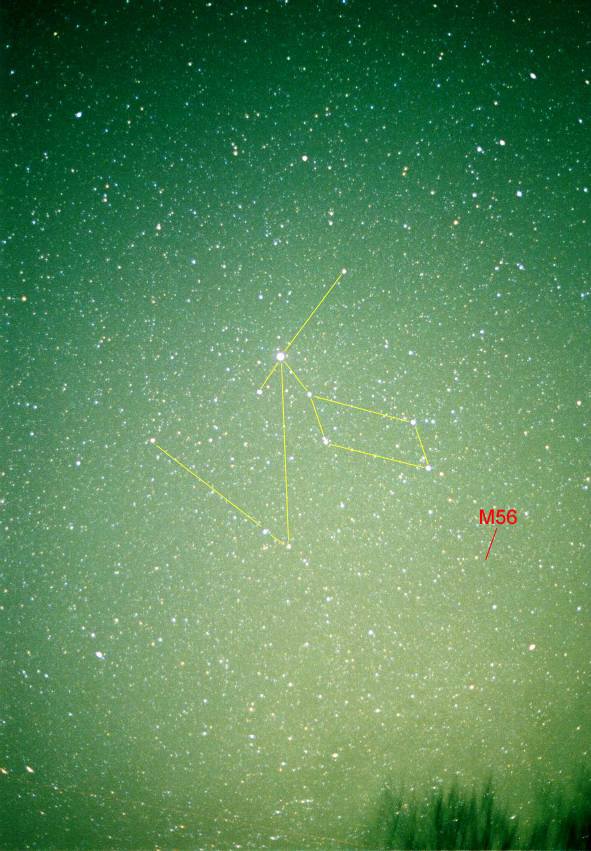 Lyra. The bright star at the center is Vega. Olympus OM-1, 50mm lens at f1.8. Kodak Max 400 film. 5 minutes piggyback exposure, manual tracking. 2000/4/30 0:43 EDT Greene County, Pittsburgh.