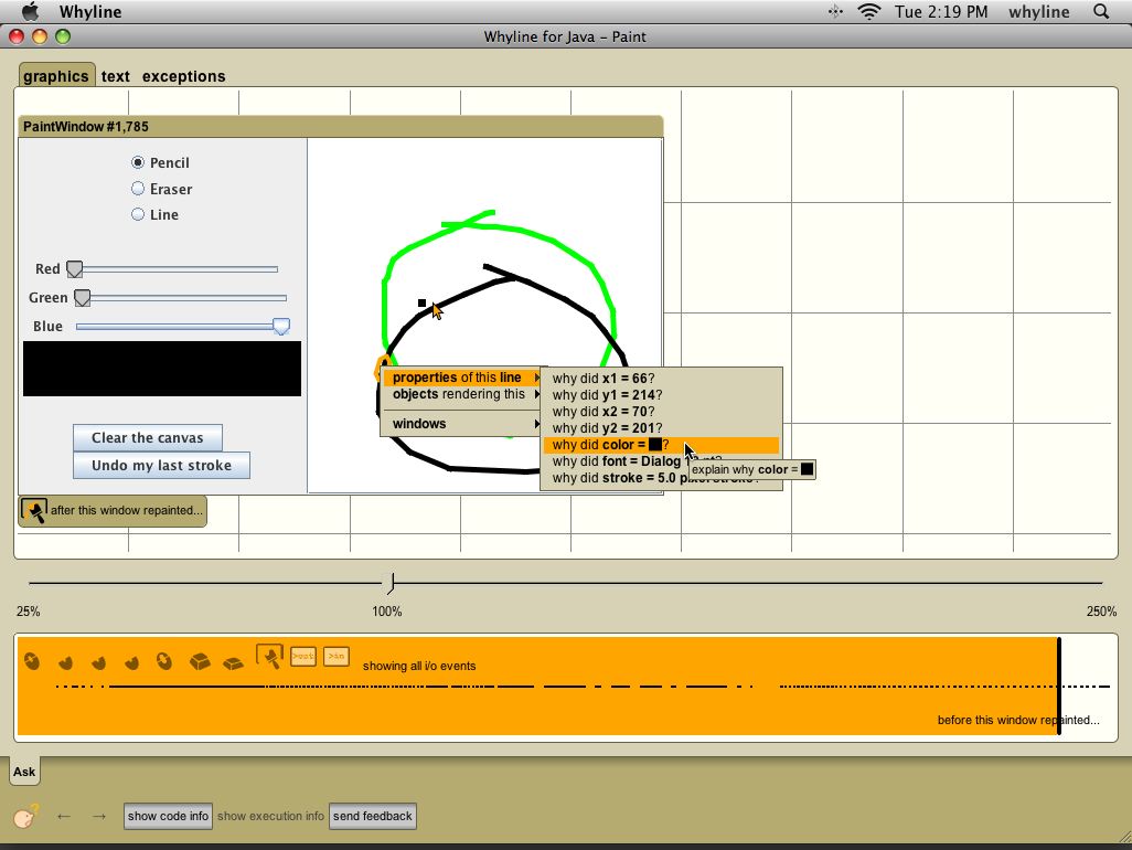 Usually when we see something go wrong in a program's output, we have to guess what code is causing the problem. We usually guess wrong. The Whyline for Java allows you to instead ask questions about a program's output and get answers in terms of the code responsible. Click the screenshot above to watch a 90 second demonstration or download the video  (5 MB). (And because I love my iPhone, here's an iPhone version too).