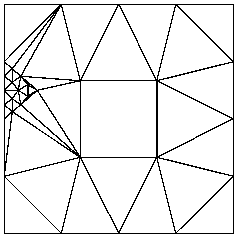 When you refine a mesh, you generally want to impose tighter quality constraints. One way to accomplish this is to use -q with a larger angle, or -a followed by a smaller area than you used to generate the mesh you are refining. In order to simplify the maintenance of a sequence of successively refined meshes, all files written by Triangle have iteration numbers in their filenames; the iteration number of each mesh is one greater than that of the mesh it was created from. In the example below, the input mesh (which you saw created on the Delaunay triangulation page) has iteration number one, and consists of the files box.1.node and box.1.ele.