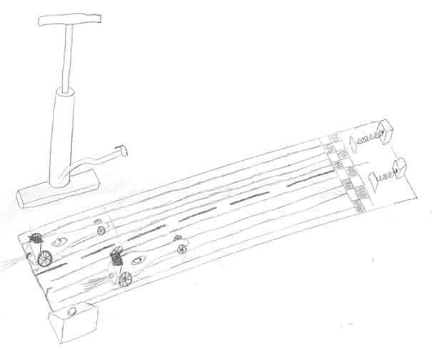 The Drag Racer is based on the principles of fluid mechanics including the ideas of pressure and flow velocity. The air pump is used to pressurize chambers within the cars and a quick release mechanism connected to a button releases the pressurized air in the chambers through nozzles in both cars simultaneously.