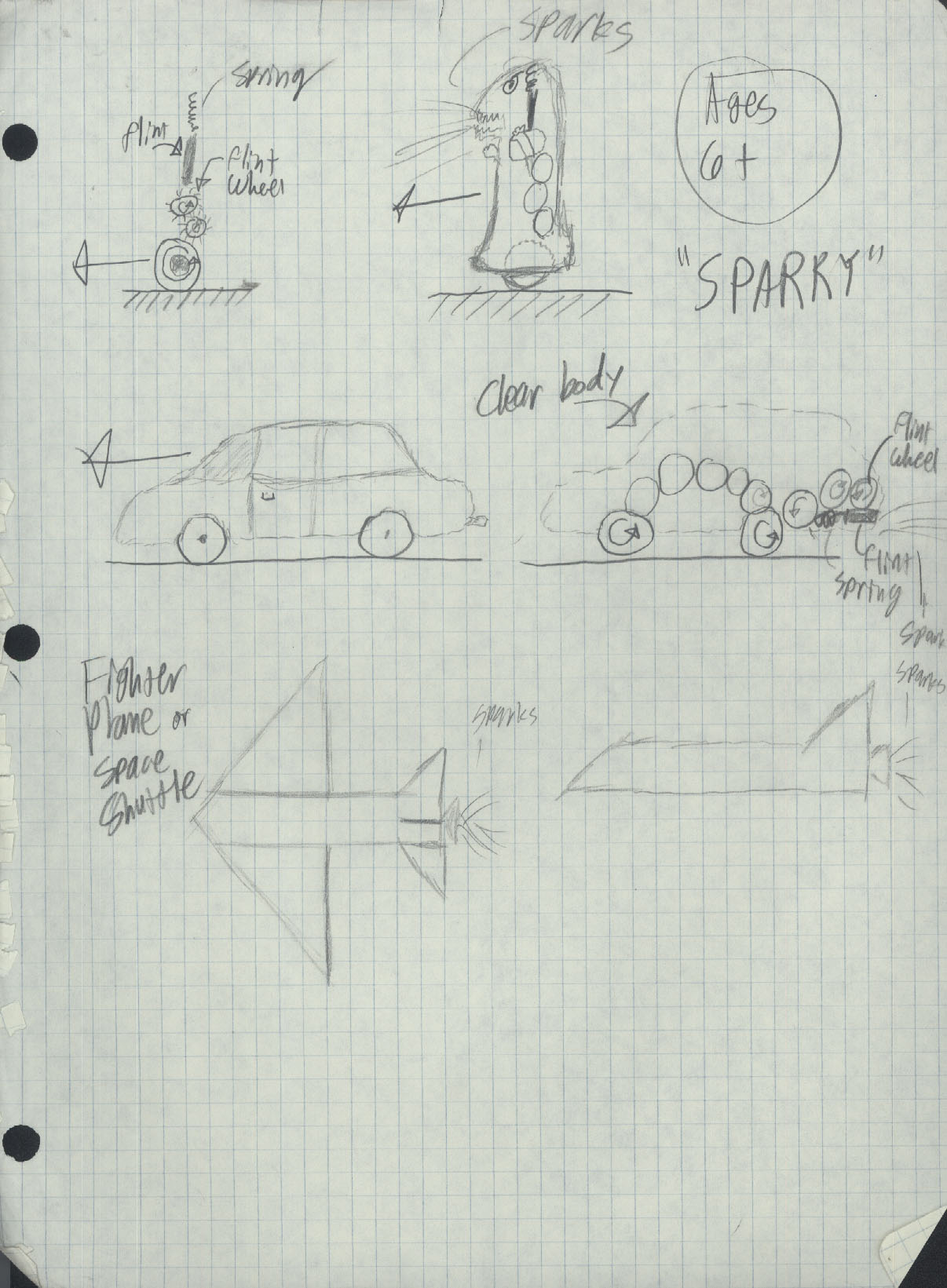 Sparky is a toy for children who are old enough to understand the risks of fire (ages 8+). The Sparky toys come in many different forms including monsters, cars and jet planes. Each of the toys are based on the same mechanism of a piece of flint strinking a flint wheel. For the monster toy, the sparks fly out of the mouth when the child pushes the toy forward on the ground. Gears connected to the wheels spin and engage a flint wheel which creates the sparks. The body of the toy is translucent so that the child can see the inner workings of the toy (i.e. how all the gears are connected and how they drive each other). The car and plane toys are very similar in that they have wheels that turn and engage a flint wheel that strikes a piece of flint. The car would have sparks flying out of the tailpipe and the jet would have sparks flying out of the engines. The toys should have more complex gear systems than is necessary so that the children really have a grasp of how gears work together (perhaps there could be patterns on the gears so that the children can see and predict which way the gear will turn).