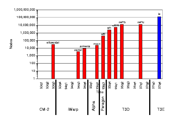 Figure 0 shows the history of the Quake project in terms of largest mesh size as a function of time. After we finished the Archimedes tool chain in the 2nd quarter of 1995, the mesh sizes increased at a rate of about 1 order of magnitude per quarter. The red bars indicate simulations that have been implemented. The blue bar shows the projected size of the ultimate goal, a 1 second simulation of the entire LA Basin.