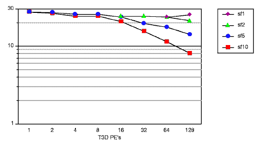 Figure 14. MFLOPS per PE during main loop on the Cray T3D. (GIF) (postscript)