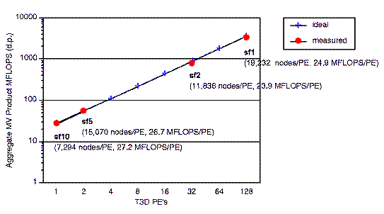 Figure 14 shows the MFLOPS per PE sustained during the sparse matrix-vector product operations as a function of the number of PE's. The smaller simulations run out of work on larger numbers of PE's. However, the larger simulations are able to sustain rates of roughly 25 MFLOPS per PE. These rates are attained with compiler generated C code. No assembly language tuning was necessary.