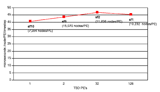 The truest measure of scalability is the actual running time. Figure 17 shows the time per node per PE per timestep when the number of nodes per PE is roughly constant. As the graph shows, this time is constant to within 10%, and the difference is accounted for by the fact that we are not able to get the number of nodes per PE exactly equal for the different simulations.