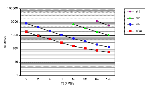 Figure 11 shows the running times for the San Fernando family of meshes (excluding the initial file input) as a function of the number of T3D processing elements (PE's). The largest simulation, sf1, requires about 1.5 hours to simulate 60 seconds of shaking on 128 PE's.