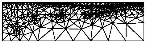 The second manner of using the -a switch is applicable only when creating a new mesh from a PSLG. The file describing the PSLG itself contains area constraints, each of which is applied to a segment-bounded region; see the .poly file format for details. For an example, look at the last seven lines of la.poly, which describes a vertical cross section of soil in the Los Angeles Basin. Below is an illustration of the results when the -a switch is or is not invoked.