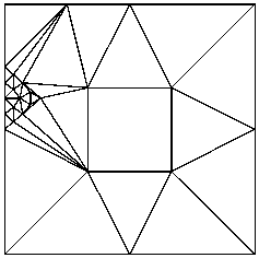 When you refine a mesh, you generally want to impose tighter quality constraints. One way to accomplish this is to use -q with a larger angle, or -a followed by a smaller area than you used to generate the mesh you are refining. In order to simplify the maintenance of a sequence of successively refined meshes, all files written by Triangle have iteration numbers in their filenames; the iteration number of each mesh is one greater than that of the mesh it was created from. In the example below, the input mesh (which you saw created on the Delaunay triangulation page) has iteration number one, and consists of the files box.1.node and box.1.ele.