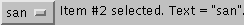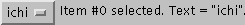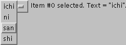 action()method (which is the same ase.arg), is the string from the selected item.[Should probably cover other useful methods, such as getSelectedItem(), getItem(), select(int), or select(String).]//...Where instance variables are defined: Choice choice; //pop-up list of choices //...Where initialization occurs: choice = new Choice(); choice.addItem("ichi"); choice.addItem("ni"); choice.addItem("san"); choice.addItem("shi"); label = new Label(); setLabelText(choice.getSelectedIndex(), choice.getSelectedItem()); . . . public boolean action(Event e, Object arg) { if (e.target instanceof Choice) { setLabelText(choice.getSelectedIndex(), (String)arg); return true; } return false; } }