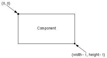 Each Component has its own coordinate system, ranging from (0, 0) to (width - 1, height - 1), with each unit representing the size of one pixel. As the following figure shows, the upper left corner of the Component's drawing area is (0, 0). The X coordinate increases to the right, and the Y coordinate increases downward.