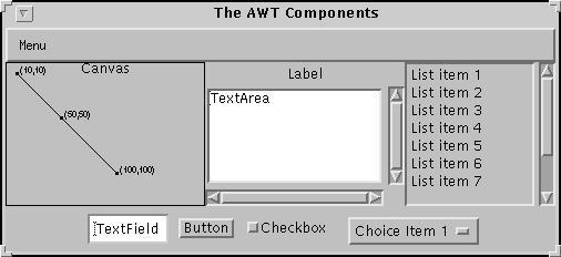The applet on this page shows you the graphical UI components we provide. Every graphical UI component is implemented with a subclass of the AWT Component class.
