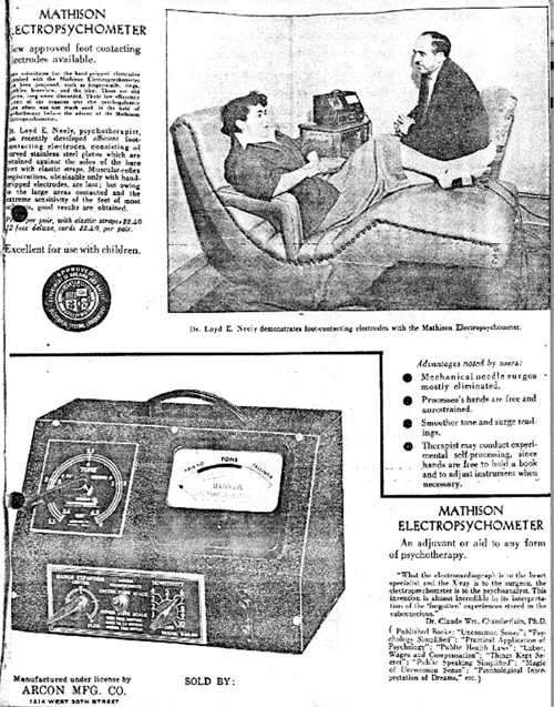 While searching through the LMT archives, librarian Jeff Jacobsen uncovered an ad from the fifties in which Dr. Claude Wm. Chamberlain, MD, proclaims "What the electrocardiograph is to the heart specialist and the x-ray to the surgeon, the electropsychometer is to the psychoanalyst." Jeff Jacobsen, when reached for comment, had this to say: "This is an important discovery for Scientologists everywhere!" In a related article in the California newsmagazine, Fortnight, it was disclosed that inventor Volney Mathison originally had patients hold onto ordinary kitchen scouring pads. Mathison had yet to discover the scientific importance of soup cans. |