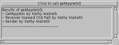 getApplets. (Here's the whole program.)public void printApplets() { //Enumeration will contain all applets on this page (including //this one) that we can send messages to. Enumeration e = getAppletContext().getApplets(); . . . while (e.hasMoreElements()) { Applet applet = (Applet)e.nextElement(); String info = ((Applet)applet).getAppletInfo(); if (info != null) { textArea.appendText("- " + info + "\n"); } else { textArea.appendText("- " + applet.getClass().getName() + "\n"); } } . . . }