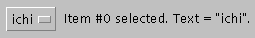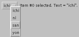 action()method (which is the same ase.arg), is the string from the selected item.Besides the methods used above, the Choice class defines these other useful methods://...Where instance variables are defined: Choice choice; //pop-up list of choices //...Where initialization occurs: choice = new Choice(); choice.addItem("ichi"); choice.addItem("ni"); choice.addItem("san"); choice.addItem("yon"); label = new Label(); setLabelText(choice.getSelectedIndex(), choice.getSelectedItem()); . . . public boolean action(Event e, Object arg) { if (e.target instanceof Choice) { setLabelText(choice.getSelectedIndex(), (String)arg); return true; } return false; } }