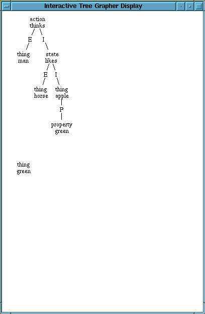 Similar to sentence 9 because of the polysemy of GREEN. In this case however a semantic snip is required as well as the syntactic snip. The first parse of the sentence after green has been processed allows semantics to fuse LIKES.action-internal-> GREEN.thing. When syntax works out that green is an adjective it snips the LIKES.verb -comp-> GREEN.noun link. In semantics, because GREEN.thing is now marked inactive a sem snip is performed.