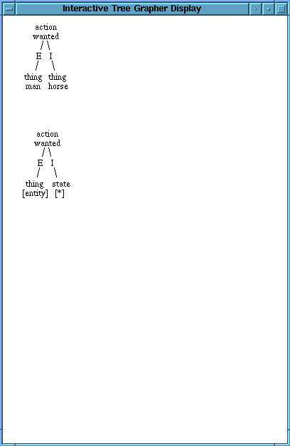 An example of a transitive verb taking a CP complement. There are two semantic entries for WANTED (one that takes an internal THING, the other an internal STATE.Because the correct (2rd) sense is chosen first no snips are necessary.