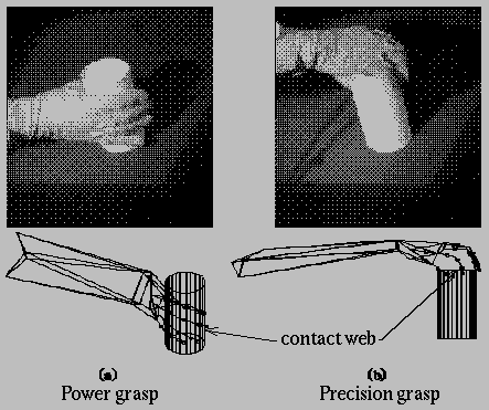 In example (b), the grasp has been identified as a five-fingered precision (disc) grasp. (The RMS error for circular fit is 0.40 cm while the RMS error for prismatic fit is 0.92 cm.)