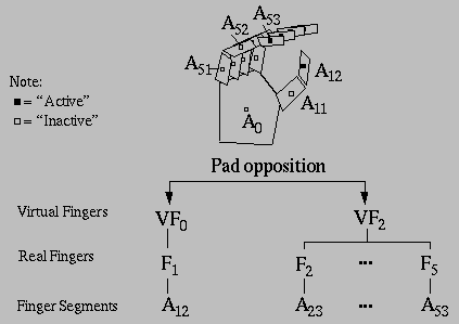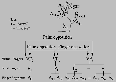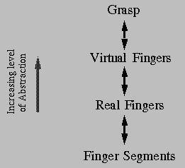The lowest level in the hierarchy contains information on the location of the finger segments which compose its respective fingers. The connection between the real fingers and virtual fingers are established using a mapping that compares object normals at the finger segment contacts. Finally, the highest level of the hierarchy is the identity of the grasp used by the human operator in the task.