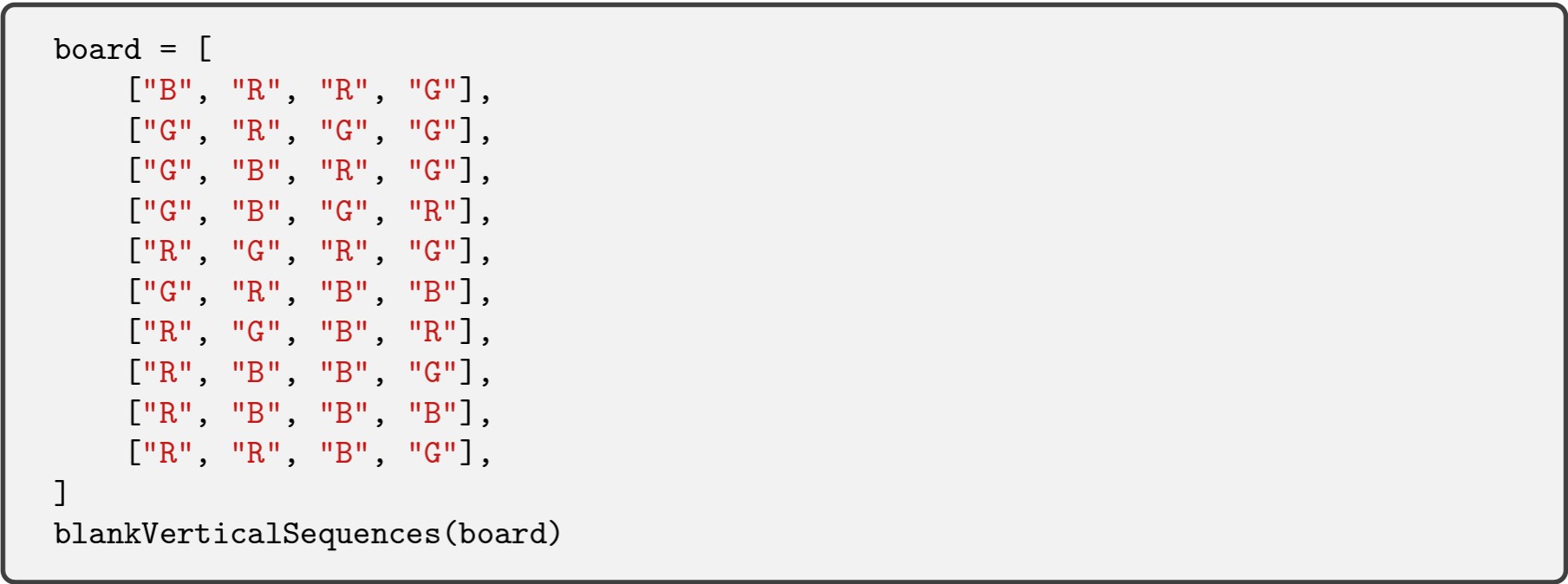 from the board. Write destructive function blankVerticalSequences(board) which, given a board, finds any vertical
