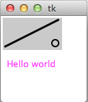 my_window = tkinter.Tk() my_canvas = Canvas(my_window, width = 120, height = 120) my_canvas.pack() my_canvas.create_rectangle(0, 0, 90, 50, fill = "grey", width = 0) my_canvas.create_line(5, 45, 85, 5, width = 3) my_canvas.create_oval(75, 35, 85, 45, outline = "black", fill = "gray", width = 2) my_canvas.create_text(45, 70, text = "Hello world", anchor = "center", fill = "magenta")