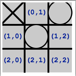 In order to represent the state of play in a game of Tic-tac-toe, we will use a two-dimensional 3x3 array, where each element is None (if the corresponding position is unoccupied), 0 if the position is occupied by the mark ("O") of the first player ("Player 0"), or 1 if the position is occupied by the mark ("X") of the second player ("Player 1"). For example, the Tic-tac-toe grid shown at right could be represented by the 2d Python list: