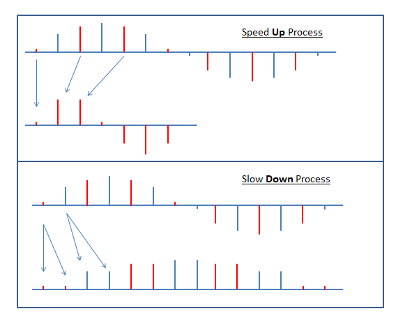Here's how it works: each number in the list is a sample, and the sound is played at the rate of 44100 samples per second. If we take a given sound and repeat some of the samples at regular intervals, we get a slowed-down version of the sound. And if we skip some of the samples at regular intervals, we get a speeded-up version. So you can implement speed(sound, factor) as follows: