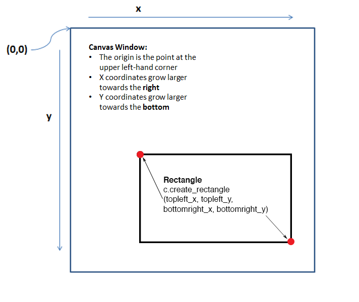 See Quick Guide to tkinter.Canvas for information about drawing graphics. Just as a quick review, in a window, the coordinate system is upside down from what you might expect mathematically. The x coordinates increase from left to right, but the y coordinates increase from top to bottom. So the origin (0,0) is in the top left corner of the window.