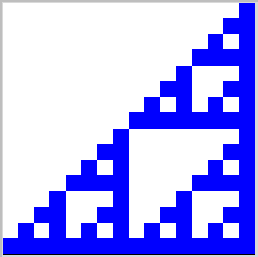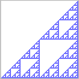The image above is a Sierpinski's Triangle (albeit, rotated and with a different angle than the canonical form). It is a fractal; that is, it is "a rough or fragmented geometric shape that can be split into parts, each of which is (at least approximately) a reduced-size copy of the whole." In this case, you will notice that, if you look at the lower-right corner, it looks the same (down to the level of one pixel) at different levels of magnification.