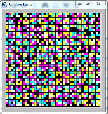 In the file random_boxes.py, write a Python function random_boxes() that creates a window of size 320 by 320 and draws a 40 by 40 grid of 8 by 8 squares, each colored a random color from black, white, yellow, cyan, and magenta. This is a simple activity that EVERYONE should be able to finish. If you haven't finished, please ask a CA to help you.