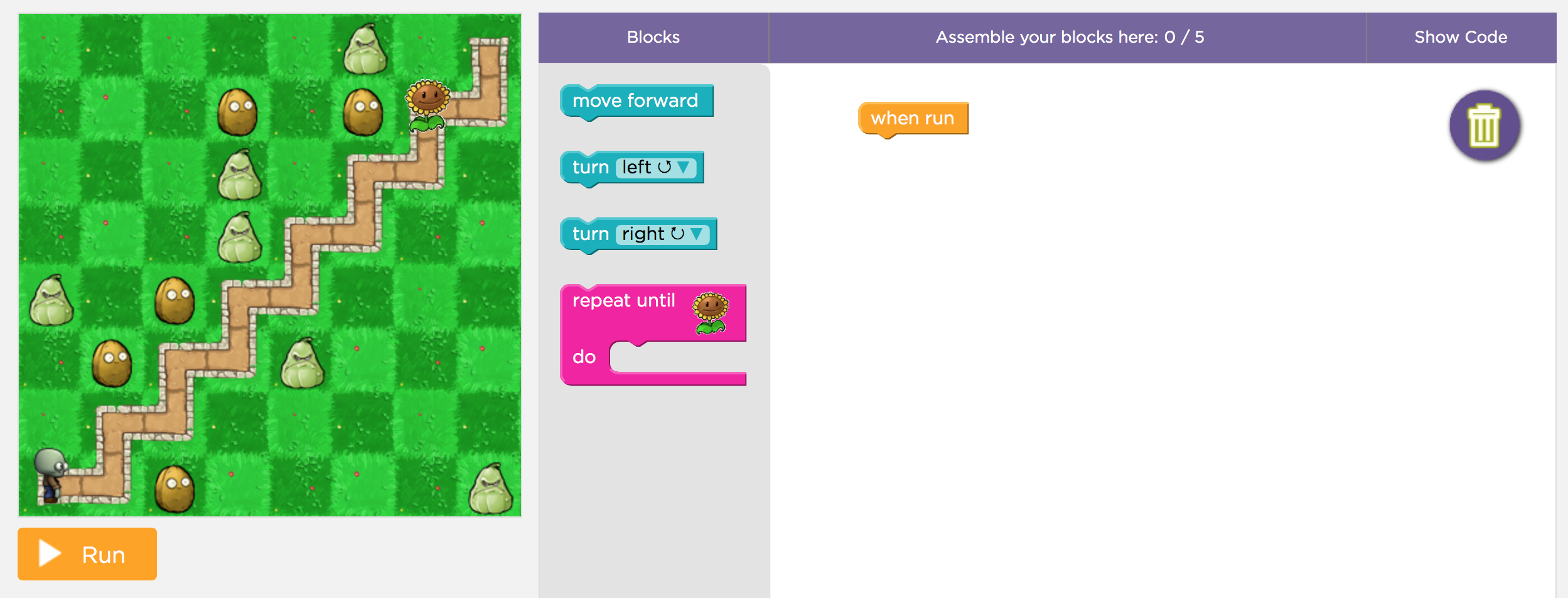 As an example, this is what a zombie maze puzzle will look like at the very start. The goal is to drag the commands together in an attempt to guide the zombie to his destination.
