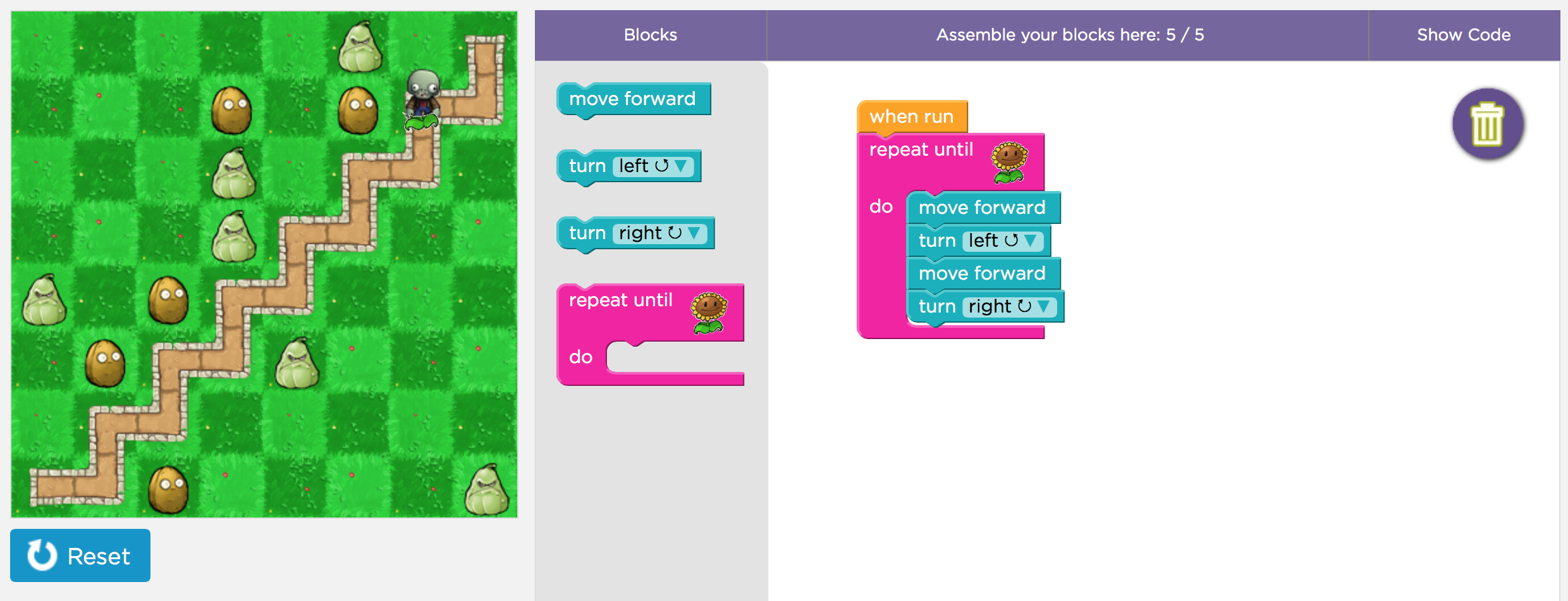 Once you have completed and tested your solution to ensure the zombie has reached its destination, the puzzle will look something like this.