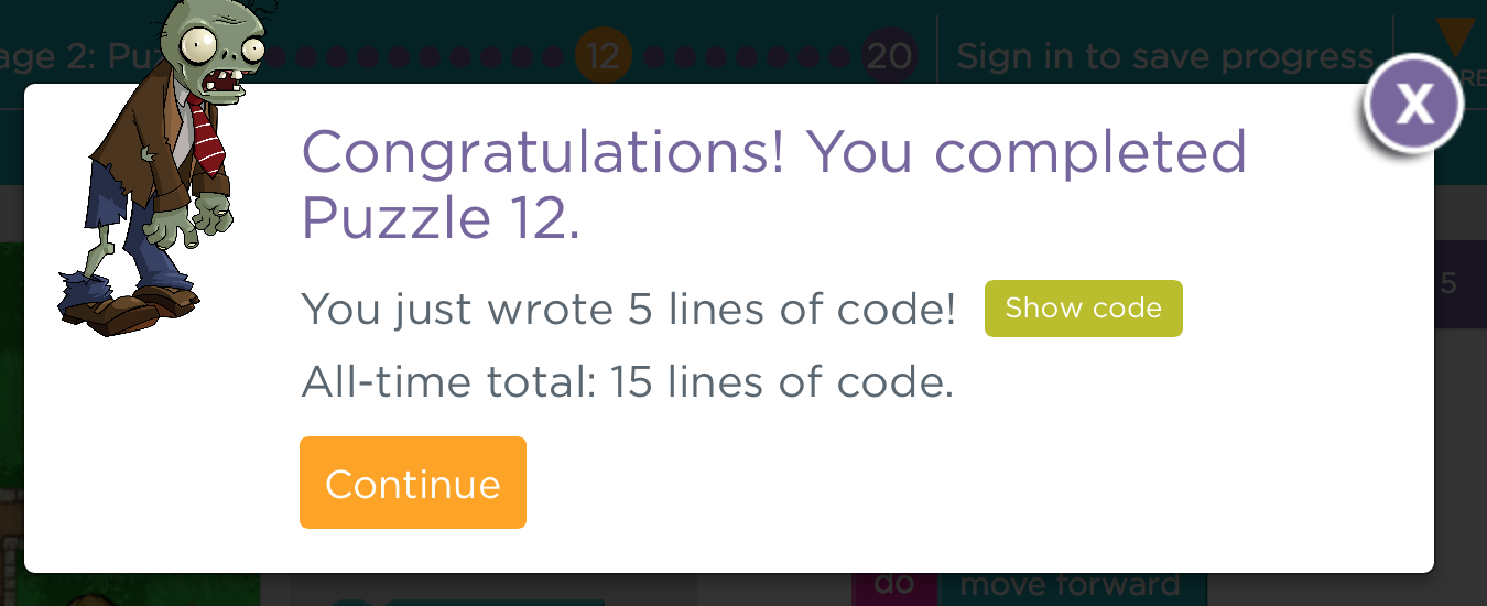 After figuring out the solution, a popup will appear on the screen. Make sure to click "Show Code". This is what will be submitted in the final solution file. For each puzzle, copy and paste the solution into a file with the name specifically outlined in the directions. . Please make sure that your browser shows all the code that you need to copy. We recommend that you do not use Safari in this assignment since you may run into issues with copying all of your code.
