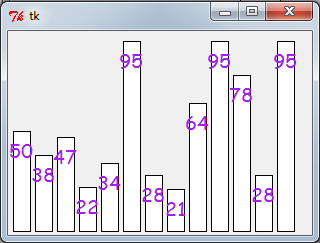 >>> sampleList1= [50, 38, 47, 22, 34, 95, 28, 21, 64, 95, 78, 28, 95] >>> bargraph(sampleList1, 600, 400)