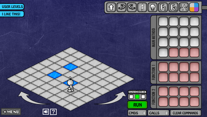 Light-Bot 2 contains a set of standard levels (puzzles) divided into four categories: basic, recursion, conditionals, and expert. If you have not already, you should go and play the first few levels in the basic, recursion, and conditionals categories of Light-Bot 2 before proceeding.