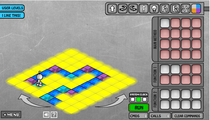 For this assignment, you will play the Light-bot 2 game in order to solve five puzzles. In the Light-Bot game, puzzles are solved by programming the robot "Lightbot" so that when Lightbot is run, he lights up all of the pulsating blue tiles, turning them to yellow.