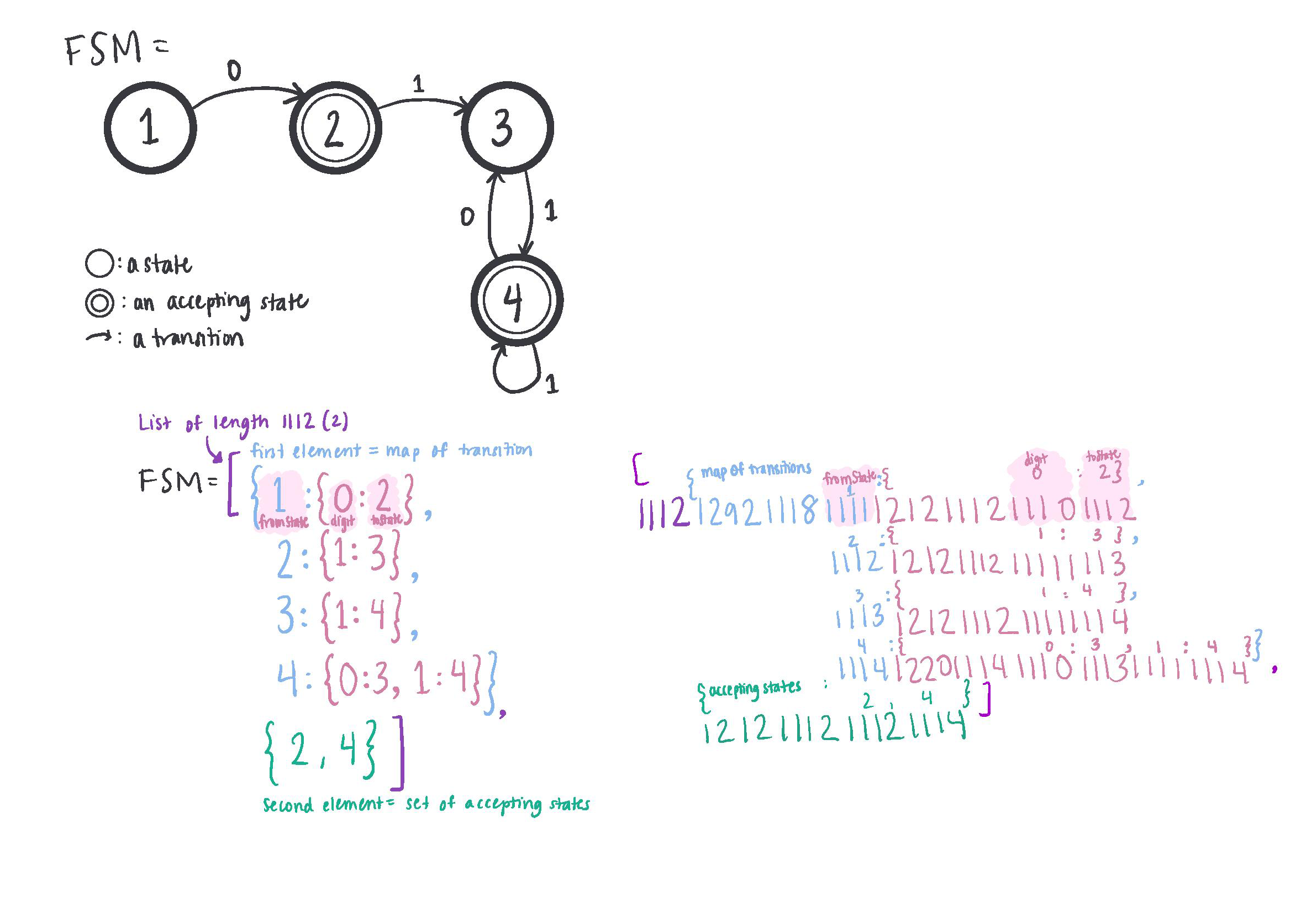 - accepts(fsm, inputValue): takes an fsm and an inputValue,