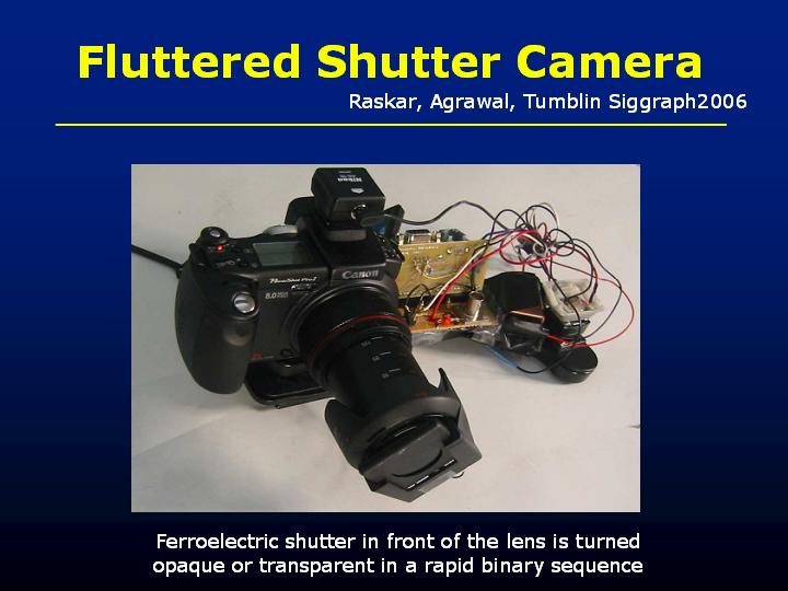 In this paper, we propose a novel coded exposure camera and show that by fluttering the shutter in a single exposure, one can retain high frequencies. The deblurring then become a well-posed problem. Our approach is thus fundamentally different from other deblurring algorithms. In fact, we use the simplest possible deconvolution approach: solving a linear system AX=B to recover the sharp image X from the blurred image B and show high quality results with large motion blurs (~300 pixels) with no ringing and deconvolution artifacts. The change in hardware amounts to putting an external ferro-electric shutter in front of the lens, synchronized with the start of the exposure time and can be done on any off the shelf digital camera.