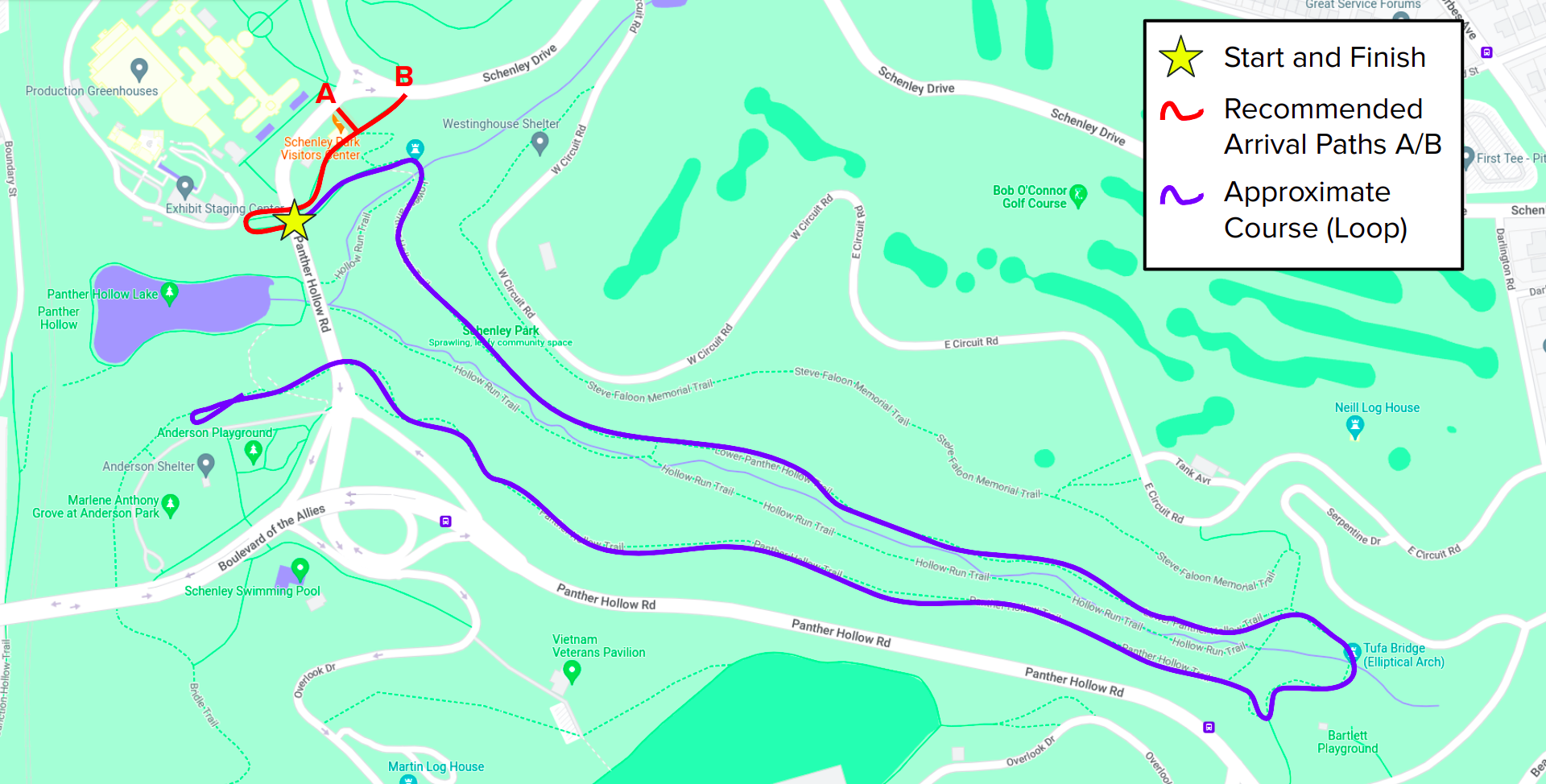 begins at point "B" on the map but can also be accessed by point "A". Point "A" is just