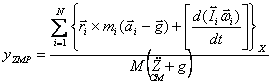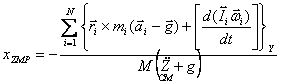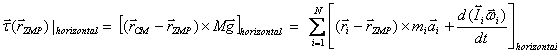 The ZMP may also be defined as appoint on the ground at which the net moment due to the inertial and gravitational forces has no component along horizontal axis. [Hirai et.al, 1998] which is expressed by,