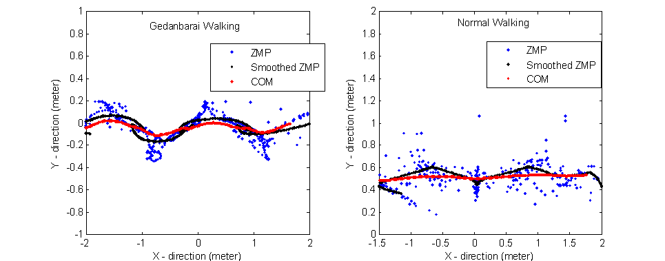 So now, with all the kinematical data the ZMP is computed for the complete gait. The ZMP for the Gedanbarai and normal walking were compared.