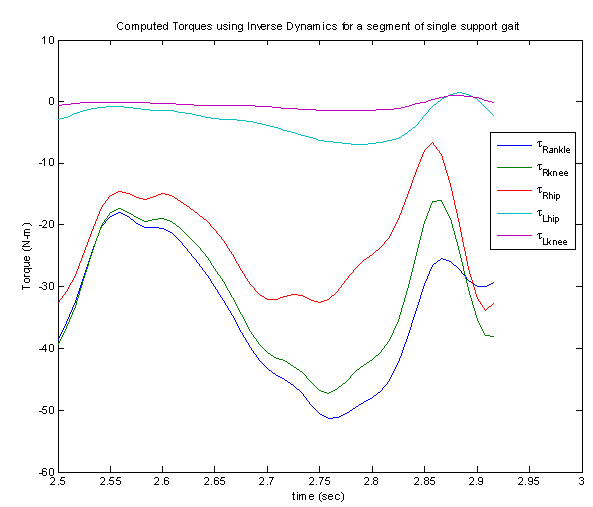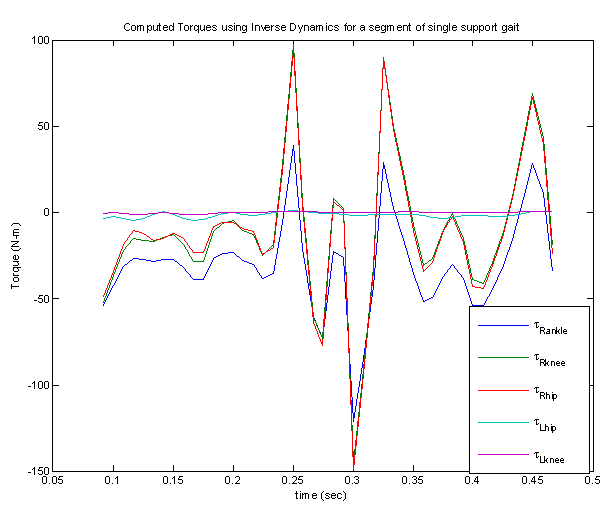The next component of the project was to compute the joint torques. The joint torques using inverse dynamics assuming a 2D model were computed using the Art Kuo’s Dynamics Workbench running on the Mathematica platform. The equations of motion were exported to the Matlab environment. The function could just take in the joint angles, velocities and accelerations and give out the joint torques. The 2D model used was approximated to with a lumped mass above the waist with no involvement of the dynamics of hand, and the assumption that the support foot is clamped to the ground. The torque trajectories were generated for a segment of gait where the right leg is the support leg and the start time was when the subject lifts the left foot off the ground and the end time was when the subject is about to touch the left leg to the ground after performing the whole swing phase for left leg and support phase for the right leg.